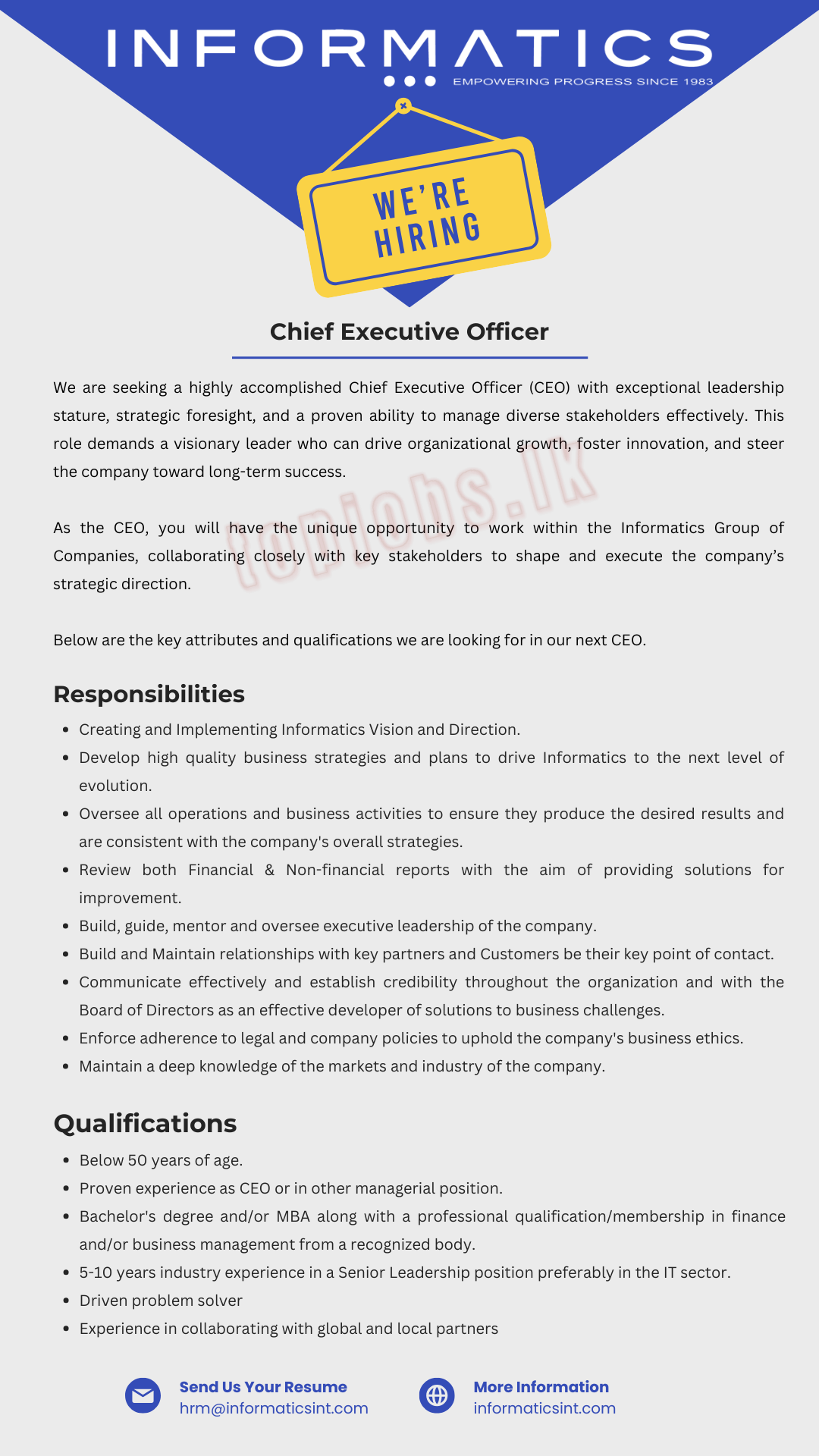As the CEO, you will have the unique opportunity to work within the Informatics Group of Companies, collaborating closely with key stakeholders to shape and execute the company's strategic direction.